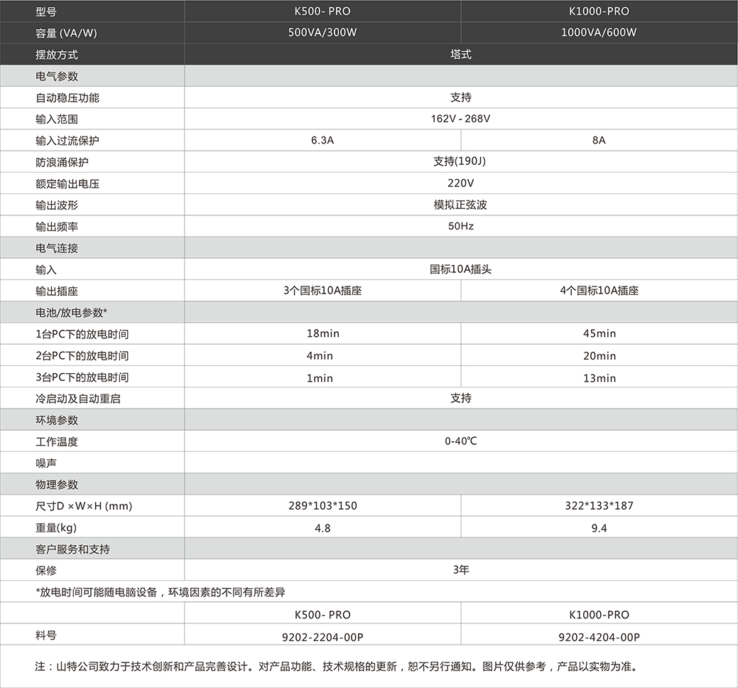 山特K500/K1000 PRO (2014)是針對中國市場電力環境優化設計的自動穩壓型UPS,通過先進MCU控制及可靠功率設計,有效的解決5種電力問題(市電斷電、電壓下陷、浪涌、欠壓、過壓),同時進一步提高了產品的適應性和可靠性,為用戶設備以及UPS本身 提供萬無一失的保障。